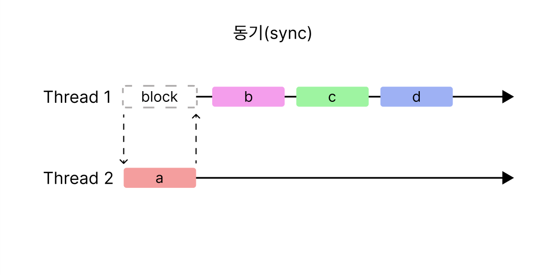 동기는 a를 2번 Thread에 보내고 a가 끝날때까지 그 뒤에 일(b)을 처리하지 않는 것이다.